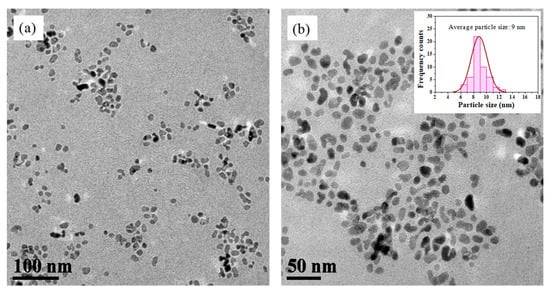 TEM images in scale 100 nm (a); and scale 50 nm (b) with a size distribution histogram and Gaussian fitting curve (insert) for average particle size 9 ± 1.25 nm (mean size ± SD).