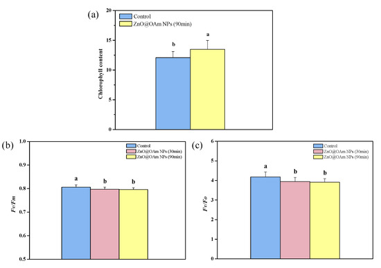 Chlorophyll content (a); Fv/Fm (b); and efficiency of the OEC (Fv/Fo) (c), of tomato leaflets 30 and 90 min after the spraying of tomato plants with distilled water (control) or with 15 mg L−1 ZnO@OAm NPs. Columns having different lowercase letters are statistically different (p < 0.05). Bars in columns represent standard deviation.