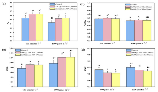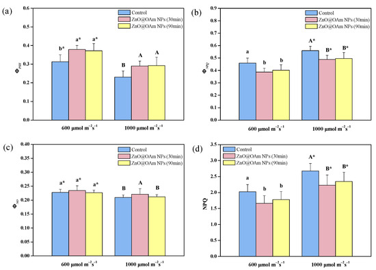 An increased ΦPSII can be attributed either to the fraction of open PSII reaction centers (qp) or to the efficiency of these centers (Fv’/Fm’) [91]. The increased ΦPSII at 30 min after being sprayed with ZnO@OAm NPs was due to the increases in both qp (Figure 5a) and Fv’/Fm’ (Figure 5b), while after 90 min, it was due only to the increase in qp (Figure 5a).