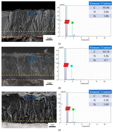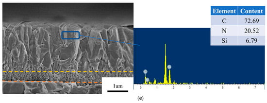 To further obtain the material properties of as-deposited diamond film, EDS was used to investigate the elemental distribution and content of the as-deposited diamond films, as shown in Figure 2. For the growth time of 0.5 h, the N and Si concentrations reached 41.21 and 20.98 at%, respectively, while the C concentration only reached 37.81 at%. Thus, the high-N-concentration doping of diamond film can be achieved, which resulted as completely different from the conventional deposition method by adding N2 gas [30]. Since the reactor gas only included carbonous resources and hydrogen, the Si and N atoms in the diamond film certainly derived from the Si3N4 substrate. According to the CVD chemical reactor condition, high temperatures might lead to the decomposition of Si3N4 and thus generate the Si and N functional groups that are aggregated near the region of the substrate’s surface [28]. During deposition, these functional groups mixed the carbonous resources, and hydrogen easily doped into the diamond film. This may be the reason for the high Si and N concentrations of the S-D film. Meanwhile, as the thickness of the film increased, the substrate was fully covered by the S-D film, resulting in the inhibited decomposition of Si and N functional groups from the Si3N4 substrate. Thereafter, a rapid decrease in the Si and N concentrations in L-D film was observed for the diamond film the growth times of 1, 2, 3 and 4 h, as shown in Figure 2b–e. The C concentrations of these diamond films reached up to about 95 at%, while the Si and N atoms were also found in the L-D film due to the residual Si and N functional groups in the reactor gas.