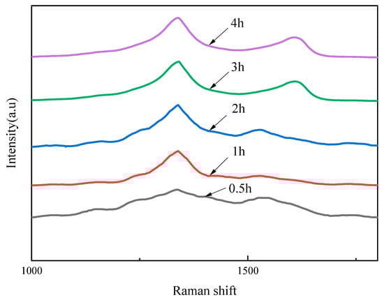 Raman spectroscopy was conducted to further investigate the diamond phase and purity of the as-deposited diamond films, as shown in Figure 3. For all the diamond films, a remarkable Raman peak was observed near the natural diamond Raman peak of 1332 cm−1, which indicated that a diamond phase was generated on the Si3N4 substrate [31]. However, these peaks presented a deviation from 1332 cm−1 with a different level, which was attributed to the change of crystalline parameters due to the internal stress. The diamond peaks of as-deposited diamond films with the growth times of 0.5, 1, 2, 3, and 4 hwere located at 1335.67, 1337.8, 1337.8, 1330.25, and 1336.76 cm−1, respectively. The internal stresses of the corresponding diamond film were calculated to be −2.08, −3.289, −3.289, 0.992, and −2.6989 GPa by the equation σ(GPa) = αΔv = −0.567 (v − v0), where Δv is the difference between the measured peak of as-deposited diamond and the characteristic peak of natural diamond [32]. On the other hand, the other Raman peaks located at 1540–1600 cm−1, which were formulated as the G band [33], were associated with the growth of graphite-like sp2 bonded components at the grain boundary of the diamond film.