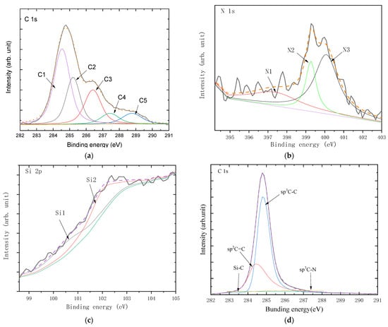 (a) C1s, (b) N1s, and (c) Si 2p XPS spectra of diamond films with the growth time of 0.5 h; (d) C1s XPS spectra of diamond films with a growth time of 4 h.