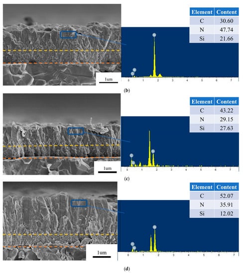 As mentioned above, the growth time played a vital role in the diamond phase and surface morphology of the diamond films. During the CVD chemical reactions, the reactor gas was always pumped into the chemical chamber to compensate for the consumption of reactor gas, and the exhaust gas, including the decomposed N and Si components, was also continuously emitted from the chemical chamber by the pump. Hence, avoiding the low-concentration gaseous N components near the substrate was required for depositing the diamond doped with the high-concentration N element. In this way, the high growth rate of diamond might be a preferable option to achieve high-concentration N doping of diamond, since the decrease in growth time was indicative of the increase in concentration of the N component near the substrate. In the previous literature [26], adding GO particles on the Si3N4 surface effectively increased the growth rate of diamond film. The deposition process of GO-diamond film was the same as in the literature [42]. The GO particles were added to the substrate surface after pretreatment of the substrate by a diamond powder slurry. The Raman spectra demonstrated that a small internal stress can be observed for the GO-diamond film. Here, the cross-sectional morphologies were characterized by an analysis of EDS to study the evolutional tendency of the distribution of Si and N atoms along the thickness direction, as shown in Figure 5. The same growth time of 0.5, 1, 2, 3, and 4 h was set to produce the GO-diamond films for comparison. For the growth time of 0.5 h, the S-D film with small diamond grains still existed, and its thickness reached 0.75 μm. However, as compared to the pure diamond film, the converse tendency of the concentration of Si and N atoms in the diamond film was found for the GO-diamond film. The weight content of Si and N atoms reached 14.31 and 46.46 at%, respectively. Here, a rapid increase in the concentration of the N atom in the diamond film might result from the stronger adsorption capacity of GO particles for the N atom relative to the Si atom during the CVD diamond growth [43,44]. For the growth time of 1 h, the distinct grain boundary between S-D film and L-D film still presented in the GO-diamond film, which was similar to that of the pure diamond film. The diamond grains grew up to a larger micro-scale size and were covered on the S-D film. The thicknesses of S-D and L-D films were measured to be 1.04 and 2.12 um, respectively. On the other hand, the weight contents of Si and N atoms were up to 21.66 and 47.47 at%, respectively, which were definitely different from the pure diamond film where the corresponding content of Si and N atoms rapidly decreased to 0.07 and 5.06 at%. To the best of our knowledge, the percentage of 47.47 at% set a new remark for the high-concentration N doping of diamond film. As the growth time increased, the concentration of Si and N atoms in the diamond film generally decreased because of the reduction of the amount of Si and N atoms in the reactor gas. For the growth time of 4 h, the weight contents of the N atom (20.52 at%) and Si atom (6.79 at%) still existed for the diamond film, which were considerably larger than those of the pure diamond film. Hence, enhancing the growth rate by adding Go particles on the Si3N4 substrate might be classified as a convenient and simplified method to achieve high-concentration N and Si doping of diamond film.