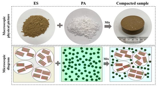In this paper, the ES was air-dried first and then passed through a 0.5 mm sieve after being crushed. To prepare a homogeneous mixture of PA and ES, the required weight of PA was first calculated from the total dry weight of ES and mixed in the dry state. The mixture of ES and PA in the dry state was then mixed with the desired water to obtain the optimum moisture content. The content of PA was 0%, 2%, 4%, 6%, and 8% of the dry weight of ES, respectively.