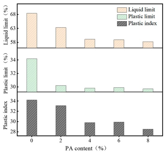 Figure 3 shows the results of the limit water contents of PA-ES composites with different PA contents. It can be seen that as the content of PA increases, the liquid limit (LL), plastic limit (PL), and plastic index (PI) of ES decreases. With an increase in the PA content from 0% to 8%, the LL decreased from 68.4% to 58.2%, while the PL decreased from 34.2% to 29.7%. When PA was added at 0–4%, the PI (PI = LL − PL) decreased significantly, from 34.2% to 29.8%. When the PA addition amount is 4–8%, the plasticity index change is not obvious. Therefore, the increase in PA content significantly reduces the limit water content and passivates the water sensitivity of the PA-ES composites.