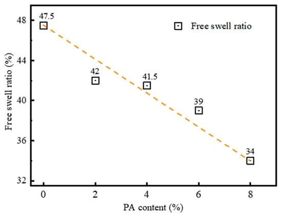 The results of the free swell ratio test are shown in Figure 4. The results show that when PA content increases from 0% to 8%, the free swell ratio decreases from 47.5% to 34%; in particular, when PA content reaches 6%, the free swell ratio decreases to 39%. According to GB 50112-2013 [31], the water-sensitive effect of samples containing 6% PA is no longer significant and does not belong to the category of expansive soil. In general, the relationship between the free swell ratio and PA content shows a linear decline, which is similar to the results of previous studies [32,33].