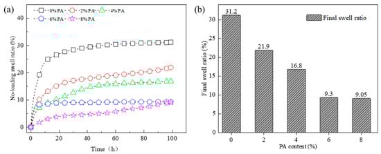 No-loading swell ratio test results for PA-ES composites: (a) the relationship between no-loading swell ratio and time history under different PA contents, (b) the relationship between PA content and final no-loading swell ratio.