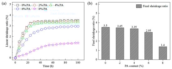 The linear shrinkage ratio of PA-ES composites with different PA contents varies with drying time, as shown in Figure 6a. The linear shrinkage of all samples increases during the initial drying stage and gradually stabilizes with increasing drying time. As the PA content in the sample increases, the linear shrinkage ratio significantly decreases. Figure 6b shows the relationship between the final shrinkage ratio and the PA content of the PA-ES composites. It can be found that compared with PA-ES composites with a PA content of 1–4%, PA-ES composites with a PA content of 6–8% have a more significant final shrinkage inhibition effect: when the PA content is 0–4%, the final shrinkage ratios are 3.5% and 3.35%, respectively; when the PA content is 6–8%, the final shrinkage ratios significantly decrease, reaching 2.95% and 1.4%, respectively. This indicates that the increase in PA content has a good inhibitory effect on the contraction of the PA-ES composite.