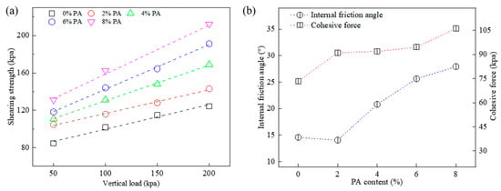 Direct shear strength test results for PA-ES composites: (a) the relationship between shear strength and vertical load under different PA contents, (b) the relationship between PA content and shear strength parameters.
