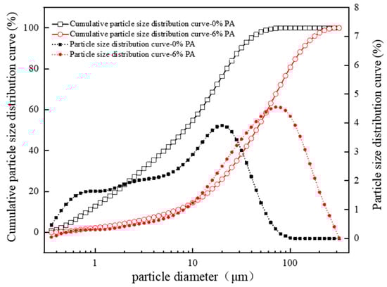 The particle size distribution of PA-ES composites with 0% PA and 6% PA content was studied, and the results are shown in Figure 8. Compared with the sample with 0% PA content, the clay content (D ≤ 0.002 mm) of the sample containing 6% PA decreased from 23.24% to 4.34%, indicating a decrease in the number of fine particles and an increase in the number of coarse particles. Based on the test results of the particle size distribution test, the grading index of the non-uniformity coefficient (Cu) and curvature coefficient (Cs) was calculated by GB/T 50123-2019 (Geotechnical Engineering Test Method Standard 2019). Compared with the sample with 0% PA content, the non-uniformity coefficient (Cu) of the sample containing 6% PA decreased from 15.85 to 8.91, and the curvature coefficient (Cs) increased from 0.79 to 1.41. It can be seen that PA can optimize the particle distribution of the sample.