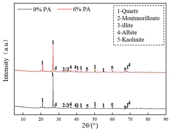 Figure 9 shows the XRD pattern of PA-ES composites containing 0%PA and 6%PA. As can be seen from Figure 9, the sample containing 0%PA contains quartz, montmorillonite, illite, kaolinite, and albite. The main reason for expansive soil is the presence of clay minerals such as montmorillonite, illite, and kaolinite in the soil. These clay minerals have two-dimensional layered structures, strong water absorption, and structural instability. As shown in Figure 9, there is no change in mineral composition in the sample with a PA of 6% compared to the sample with a PA of 0%. This suggests that the water-sensitive passivation mechanism of the PA-ES composite is not achieved by the formation of new minerals.