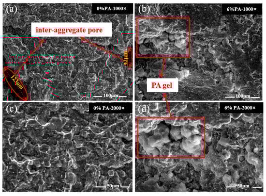As shown in Figure 10, we studied the micromorphologies of samples containing 0%PA and 6%PA at different multiples. Figure 10a,c show the microstructure of the PA-ES composite containing 0%PA. There are large pores in the image, which may threaten the stability of the structure. Figure 10b,d show microscopic images of the PA-ES composite containing 6%PA. As can be seen from the figure, PA and ES can combine well, fill the pores between aggregates in the structure, wrap ES particles, and play a good bonding effect.