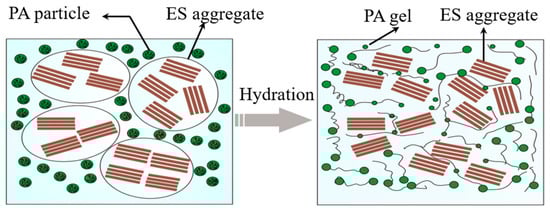 Based on the above discussion, a mechanism diagram of the water-sensitive passivation effect of the PA-ES composite was drawn (Figure 11). There are a considerable number of organic reactive groups in the PA polymer chains, which are uniformly pressed into the pore structure of the sample. When the PA meets water, the polymer chain unfolds gradually and the reaction is activated. With the progress of hydration, on the one hand, the surface of ES particles reacts with some active groups in PA. The surface reactivity of ES particles is changed through adsorption and bonding, and the size of ES particles is increased. On the other hand, as PA further cemented, adhered to, and filled the occluded sample pore structure, a three-dimensional gel structure was finally formed in the sample. The engineering function of this three-dimensional gel structure can be expressed as follows. When absorbing water and wetting, it effectively limits the water entering into the ES particles, increases the toughness and strength of the sample after saturation in water, and can flexibly offset the swelling deformation. When losing water and drying, the gel barrier formed between the particle will limit the discharge of water from the sample, locking the water inside the ES particles and limiting the shrinkage of the sample.