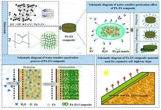 - When the PA-ES composite reacts with water, PA increases the ES particle size through adsorption, reduces the content of clay particles, optimizes the gradation, and thus reduces the water reactivity of clay particles. By bonding, agglomeration, and filling, the deformation of the composite was inhibited and the strength of the composite was improved. The above reaction mechanism is also reflected in the macroscopic engineering characteristics of the PA-ES composite.
