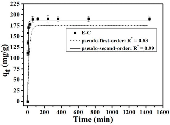 where qt is the P adsorption amounts at time t, and qe is the P adsorption amounts at equilibrium time; k1 is the first-order kinetics’ adsorption rate constant, and k2 is the second-order kinetics’ adsorption rate constant. The results showed that the coefficient of determination simulated with the pseudo-second-order model (R2 = 0.99) is higher than the pseudo-first-order model (R2 = 0.83) (Figure 1), which suggested that the pseudo-second-order kinetic model can well describe the adsorption kinetic process of P onto E-C, and a monolayer chemisorption occurred on the adsorbent surface. Based on the analysis of the pseudo-second-order theory and the chemisorption characteristics of E-C adsorbent materials, chemisorption was the main rate-limiting step of P adsorption by E-C [10,24].