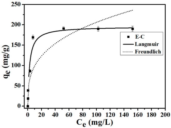 The qmax of the E-C, through calculating the Langmuir isotherm, was 195.8 mg/g, which was consistent with the experimental maximum adsorption capacity of 191.1 mg/g, indicating that the E-C adsorbent materials in aqueous solution had excellent adsorption properties for removing P. The E-C adsorbent material’s adsorption capacity for P was higher than that of the Ca-biochar adsorbent prepared from eggshell and peanut shells through ball milling and chemical impregnation methods (the maximum P adsorption capacity was 130.57 mg/g) reported by Liu et al. [28].