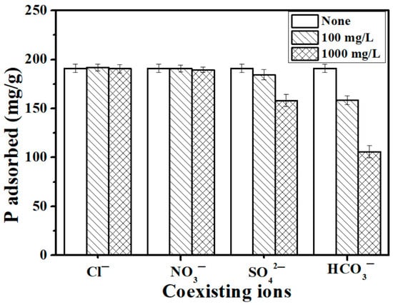 Figure 3. Effect of coexisting ions (Cl, NO3, SO42−, and HCO3) on the P adsorption capacity of E-C (dosage: 250 mg/L; temperature: 25 °C; adsorption time: 24 h; initial P concentration: 100 mg/L).