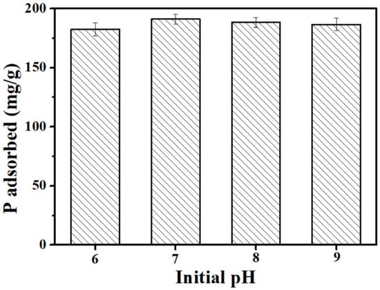 The effect of pH is an important parameter impacting the absorption performance of a sorbent. Since the pH of rural domestic sewage is generally nearly 6–9, the effect of the initial solution pH (6–9) on the adsorption of P onto the E-C was examined. The P adsorption amount onto the E-C increased from 182.6 mg/g at pH = 6 to 191.1 mg/g at pH = 7 (Figure 4). Additionally, the P adsorption amount onto the E-C slightly decreased to 188.5 mg/g at pH = 8 and 186.7 mg/g at pH = 9 (Figure 4). Thus, the E-C adsorbent material showed a good adsorption effect on P under the initial pH range of 6–9.