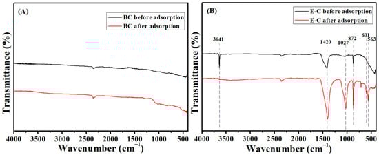 Figure 5. The FTIR spectra of BC (A) and E-C (B) before and after P adsorption.