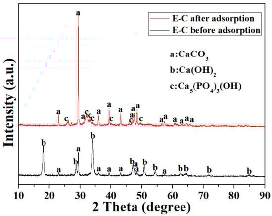The diffraction patterns of the E-C before and after P adsorption showed a significant change in the XRD spectra analysis (Figure 6). Before adsorption, the E-C had CaCO3 characteristic peaks (PDF #05-0586, 2θ = 23°, 29.4°, 36°, 39.4°, 47.5°, 48.5°, and 57.4°) and Ca(OH)2 characteristic peaks (PDF #04-0733, 2θ = 18.1°, 28.7°, 34.2°, 47.1°, 50.9°, 54.4°, 62.6°, 64.3°, 71.8°, and 84.8°). Ca(OH)2 groups are the main active sites in the E-C adsorbent materials for P adsorption. CaCO3 groups in eggshells were not fully decomposed at 800 °C. In Lee’s study, at a calcination temperature of 800 ℃, the mineral composition of eggshell still contained 35.7% CaCO3 [8].