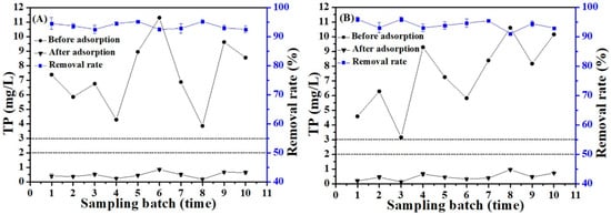 Figure 8. The removal rate of TP in rural domestic sewage by E-C, (A) F1 and (B) F2 (dosage: 250 mg/L; temperature: 25 °C; and adsorption time: 4 h).