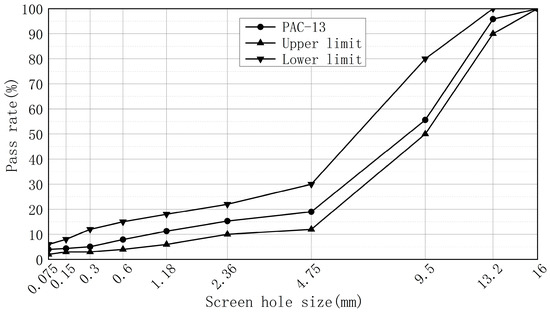 This article uses the PAC-13 (drainage asphalt mixture with a maximum particle size of 13 mm) asphalt mixture, whose synthetic gradation curve is shown in Figure 1.
