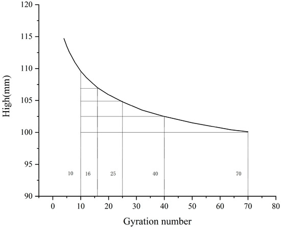 This paper studies the formation mechanism and evolution law of the asphalt mixture skeleton under different compaction processes, so it is required to select the appropriate gyration number as 0 to 70 times the standard for subsequent specimen molding. An SGC specimen with a height of 100 mm is formed using a gyratory compactor (TIPTOP, Changsha, China) and a plot of the height vs. gyration number is plotted, as shown in Figure 2.