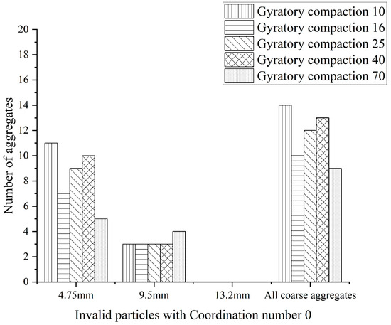 A total of 500 coarse aggregates with three-dimensional reconstruction are selected for statistics, and the coordination number of test pieces with different compaction times is counted and calculated. The statistics and calculation results are shown in Figure 6 and Figure 7 below.