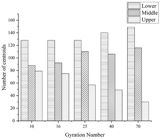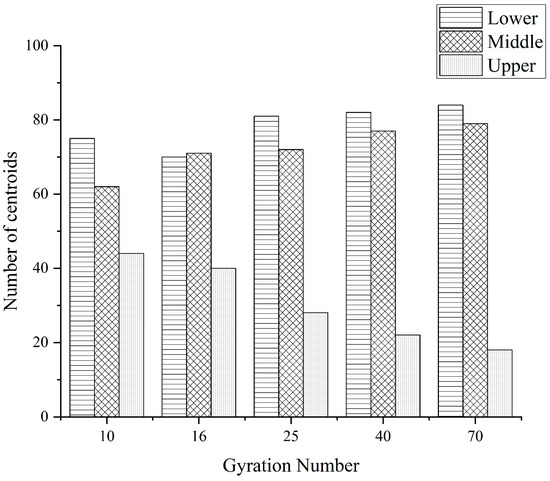 In different compaction processes, it is possible to intuitively observe how the aggregate moves during the compaction process by distributing the centroids of each aggregate. In order to better quantify the distribution of the centroid in different compaction cases and more convenient analysis, it is stipulated that the standard rotary compaction specimen 1/3 and below (0~33.3 mm) is the lower layer, the standard rotary compaction specimen 1/3 to 2/3 (33.3~66.7 mm) is the middle layer, and the standard rotary compaction specimen 2/3 and above (66.7~100 mm) is the upper layer.