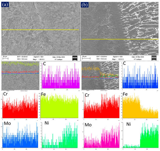 The EDS line map was carried out on as-welded samples across the interface of WM and P92 to determine the diffusion of elements from the WM to P92-steel (Figure 4a,b). No significant diffusion was observed for the P92 filler because it has a similar composition to that of the P92 base material (Figure 4a). This confirms that the hardness variation was due to the change in the microstructure of the HAZ of P92, not from the elemental alteration due to diffusion of the elements from the WM to P92-HAZ. However, a significant element variation is seen at the interface of the weld and P92 BM for the ERNiCrCoMo-1 filler (Figure 4b). The major variation is seen for Cr, Mo, Fe, and Ni. The line map confirms the diffusion of Fe from the P92 base matrix to the weld, as well as the diffusion of Cr, Ni, and Mo from the weld to the P92 base matrix. A similar observation has also been made in our previous study from the P92 filler [22] and the IN617 filler [23] welded joint.