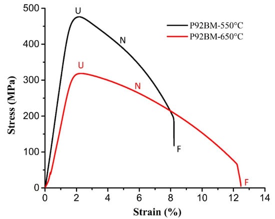 HT tensile characteristic of P92 BM at 550 °C and 650 °C.