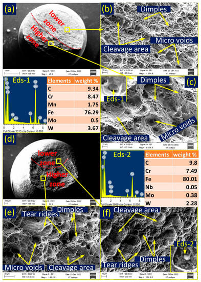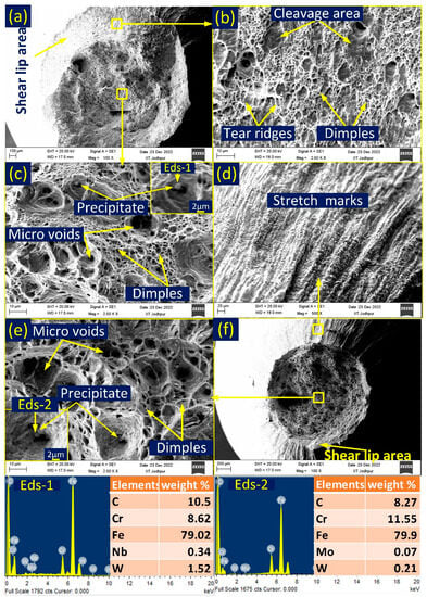 The fractography of P92-weld-550 °C and P92-weld-650 °C samples is shown in Figure 7a–c and Figure 7d–f, respectively. At both temperatures, a cup–cone-shaped fracture was observed with shear lips, as shown in Figure 7a,b. The fracture mouth area of P92-weld-650 °C is less than the sample tested at 550 °C. The percentage area reduction is also shown in Table 1. The central region and shear lip of the fracture surface are shown in Figure 7b,c. The central area is mostly filled with dimples combined with microvoids; thus, the material is ductile in nature in the central region. The shear lip area indicates a shallow microvoid, cleavage area, tear ridges, and dimples, which indicates less ductility than the central region. Thus, for P92-weld-550 °C, this indicates a mixed mode of fracture characteristic. On the other hand, the P92-weld-650 °C sample indicates deeper microvoids rather than shallow dimples, and the size of the dimples and microvoids is also larger than the size observed at 550 °C (Figure 7e). From the morphology of the fracture surface, we can infer that a more ductile nature can be seen at 650 °C than the tested 550 °C. When a tensile sample undergoes stress, the stress concentration around the precipitates can cause localized deformation, leading to the formation of microvoids. These microvoids may grow and coalesce, eventually leading to the initiation and propagation of cracks. The point energy dispersive spectroscopy (EDS) was taken at the precipitate observed inside the dimples. Points EDS-1 and EDS-2 confirm that the Cr-rich (M23C6) carbide secondary phase [25] was observed in the vicinity of the microvoids. The outer surface near the fracture area is also seen via the SEM observation, and the surface was found rough due to axial force; stretch marks are shown in Figure 7d. Stretch marks on the outer surface of the lip can indicate that localized deformation has occurred in this area and that the material has undergone significant elongation or stretching.