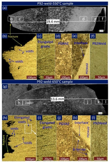 Macrograph and microstructure of longitudinal section of P92-weld sample. (a) SEM image of fractured specimen P92-weld-550 °C; optical image of various marked location of (a): (b) fracture tip(c) elongated grains(d) FGHAZ (e) Interface (f) P92 weld (g) SEM image of fractured specimen P92-weld-650 °C; optical image of various marked location of (g): (h) fracture tip (i) elongated grains (j) FGHAZ (k) interface (l) P92 weld.