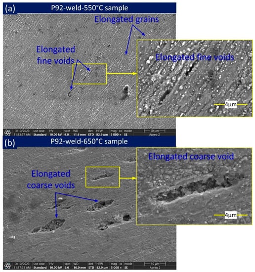 The macrograph in Figure 8a,g indicates the fracture location is 19.4 mm from the weld interface for P92-weld-550 °C and 13.6 mm for P92-weld-650 °C. Larger-sized voids are seen near the fracture location in P92-weld-650 °C than in P92-weld-550 °C, as depicted in Figure 8c,i. The grains are elongated near the fracture location and are clearly seen in Figure 8b,h. Noticeably elongated voids are seen within the elongated grain in P92-weld-650 °C, whereas no elongated voids are seen in the optical image in P92-weld-550 °C. No appreciable void or gap was noted at the P92-weld interface (Figure 8e,k) in both P92-weld-550 °C and P92-weld-650 °C samples. Furthermore, Figure 8d,j indicates no sign of appreciable voids at the FGHAZ and weld centre region in Figure 8f,l. The near-fracture areas of P92-weld-550 °C and P92-weld-650 °C samples are further characterized. The SEM image (Figure 9a) confirms the elongated fine voids appeared at the near-fracture area of the P92-weld-550 °C sample. The coarse-size elongated void appeared (Figure 9b) at the near-fracture area of the P92-weld-650 °C sample.