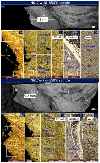 Macrograph and microstructure of longitudinal section of IN617-weld sample. (a) SEM image of fractured specimen IN617-weld-550 °C; optical image of various marked location of (a): (b) fracture tip (c) FGHAZ (d) Interface (e) weld; (f) SEM image of fractured specimen IN617-weld-650 °C; optical image of various marked location of (f): (g) fracture tip (h) FGHAZ (i) interface (j) weld.