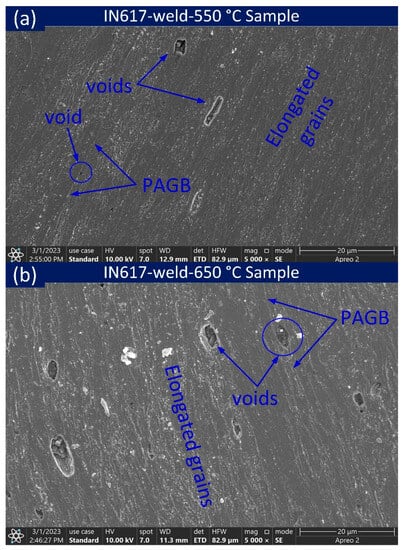 An optical light image of the longitudinal section of macroscopic and microscopic characteristics of IN617-weld-550 °C and IN617-weld-650 °C was indicated in Figure 11. The macrograph (Figure 11a,f) indicates the fracture surface was 4.9 mm and 5.2 mm from the respective weld interface of IN617-weld-550 °C and IN617-weld-650 °C, respectively. The large-sized voids were observed just near the fracture location (Figure 11b,g). Near the fracture location, elongated grains and elongated voids were observed and no evidence of appreciable voids or elongation of grain was observed at the HAZ, interface, and weld of IN617-weld-550 °C (Figure 11c–e) and IN617-weld-650 °C (Figure 11h–j). Additionally, the voids and elongated grains seen in the optical image near the fracture are confirmed in the SEM image. Both coarse and fine voids were observed near the fracture locations. In ICHAZ, near the fracture location, fine voids were observed over the PAGBs, confirmed by the SEM images (Figure 12a) for IN617-weld-550 °C, and for IN617-weld-650 °C, comparatively coarse voids were noticed on the PAGBs (Figure 12b). The microstructure in Figure 12 also illustrated large particles distributed near the voids and along the grain boundaries.