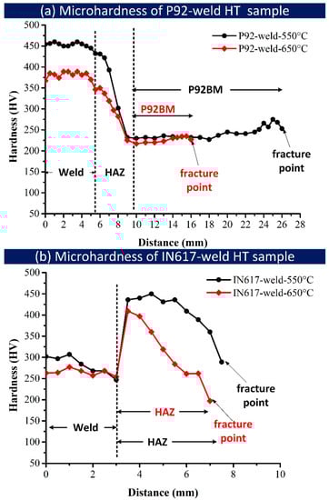 Based on the as-welded sample hardness profile for both welded plates (P92-weld and IN617-weld), the highest hardness was noticed in the position just near the fusion interface, i.e., CGHAZ, while the lower value of hardness was observed in ICHAZ. It can be seen that ICHAZ was the weakest region of the weldments (Figure 3a). However, the P92-weld sample failed from P92 BM instead of the ICHAZ, whereas in the IN617-weld sample, failure was observed at ICHAZ. The macrograph of the longitudinal section of the tested sample of the P92-weld indicates (Figure 8a,g) that the location of HAZ is very far from the fracture location, whereas the macrograph of the longitudinal section of the tested sample of the IN617-weld indicates (Figure 11a,f) that the fracture location is ICHAZ of P92. The hardness variation along the longitudinal section of the tested samples (P92-weld and IN617-weld) from the weld centre to the near-fracture location is depicted in Figure 13a,b. The sample of P92-weld tested at 550 °C indicates comparatively more hardness values of respective zones (weld, HAZ, 92BM) than the sample tested at 650 °C. The P92-weld displayed the highest hardness in the weld and the lowest at the outer edge of the HAZ and fracture location. The hardness of weld metal in P92-weld-550 °C and P92-weld-650 °C was 454 ± 4 HV and 382 ± 7 HV, respectively. The reduction in hardness of other regions of the weldments was also observed. The reduction in hardness might be due to the tempering reaction, which is a function of the operating temperature and time. For the IN-617 weld, a lower hardness was measured for the weld metal tested at 650 °C as compared to the sample tested at 550 °C, but the difference was low as compared to the P92-weld. This may be due to the difference in microstructure of the weld metal, i.e., martensitic in the P92-weld and austenitic in the IN617-weld. The weld metal exhibited hardness values of 287 ± 17 HV and 266 ± 7 HV for IN617-weld-550 °C and IN617-weld-650 °C, respectively. For the region of P92 HAZs, a similar trend is observed in the IN617-weld as noticed in the P92-weld.