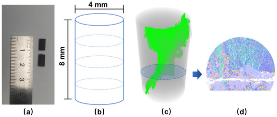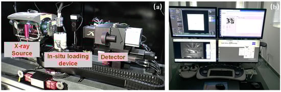 The CT equipment used in this test is a ZEISS Xradia Versa 520 3D X-ray microscope, commonly known as micro-CT. Different from the traditional X-ray CT, this micro-CT has a microscope-level magnification architecture that combines geometric and optical magnification [14]. The main components of the micro-CT are an X-ray source, an in situ loading device, and a detector (Figure 2a).The energy of the X-ray source ranges from 30 to 160 kV and the highest imaging resolution can reach 0.7 μm, which is the highest among similar instruments at the micron level. The internally equipped in situ uniaxial compressor (Deben MICROTEST compression stage) collects stress and strain values at a rate of 3–10/s, with a maximum loading pressure of 5000 N and a loading rate of 0.03 mm/min. This loading apparatus was placed on the rotary table of the CT facility, so that it could rotate together. Therefore, the real-time CT scanning without unloading could be achieved by this micro-CT. In this research, the resolution of CT images is 5 μm/pixel.