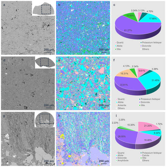 The mineral analysis was conducted using the AMICS system on FE-SEM after sample failure. In order to acquire as much information as possible about the spatial distribution of fractures and minerals, the region next to the main crack was tested. This is why the tested areas of the three samples are irregular in shape (the small pattern in Figure 4a,d,g). The main mineral in all these samples is dolomite, with a content of 61.27%, 33.81%, and 28.55%, respectively. Another main mineral composition is albite, which has the highest content of 31.45% in Sample 2-2, almost reaching the content of dolomite. The quartz content is greatly varied; it is 3.13% and 9.61% in Samples 1-2 and 2-2, while up to 21.20% in Sample 3-2. Another difference is that only Sample 2-2 contains ankerite with a relatively high content of 15.31%, and Sample 3-2 contains a small amount of amphibole. In particular, the special feature of sample 3-2 is that it contains a calcite band, which enables the calcite content to be as high as 19.46%. Apart from that, the clay content of Samples 2-2 and 3-2 is similar (4.13% and 2.23%), less than that of Sample 1-2 (10.00%).