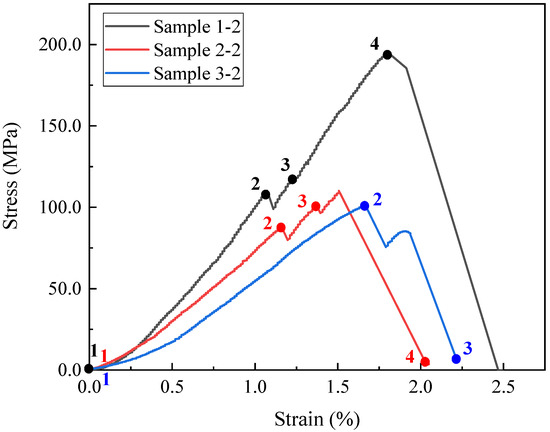 After the 6 cylindrical specimens (4 mm in diameter and 8 mm in height) were prepared, the uniaxial compression test on the micro-CT was conducted. During this loading process, temporary pauses were required for CT scanning. To determine the appropriate stress for the scan, the strength and failure process were learned roughly in advance by performing conventional uniaxial compression experiments without CT on Samples 1-1, 2-1, and 3-1. Afterwards, the same tests were conducted on Samples 1-2, 2-2, and 3-2 with real-time CT scanning. The stress–strain curves and scanning points are shown in Section 3.2.