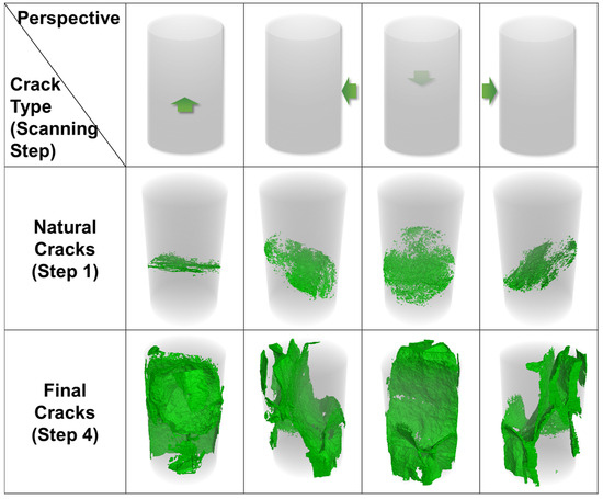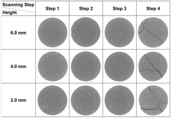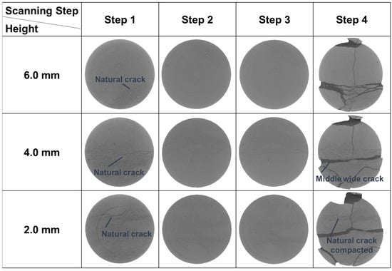 As for Sample 3-2, the small cracks had already been initiated in scanning Step 2 (Figure 8), when the stress reached peak value. After this scan, the loading continued, at the same time the cracks kept developing and the stress was increased by 9.30 MPa. Then the whole sample fractured. This means that once the cracks are initiated, the sample would fail soon.