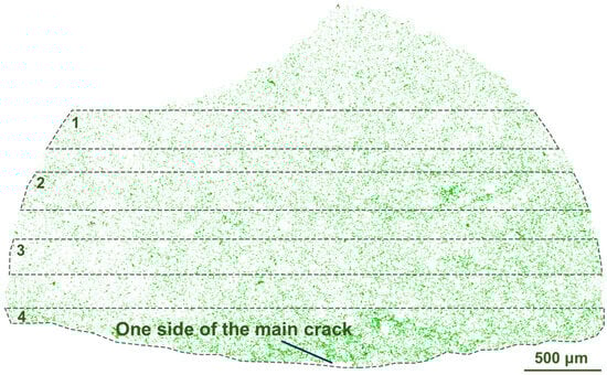 After the failure of the samples, mineral analysis was conducted based on the AMICS system on FE-SEM to study the influence of mineral distribution on crack propagation. Since the samples were fractured, the tested sections were all irregular in shape. According to the mineral analysis results, the crack development is closely related to mineral distribution. For Sample 1-2, the dominant mineral is dolomite and other minerals, such as quartz, feldspar and illite, are all scattered throughout it (Figure 4b). Among them, it seems that next to the main crack, some clay minerals are concentrated. In order to verify that quantitatively, the clay, including illite and chlorite, was extracted alone in Figure 9. The content of clay mineral in Regions 1–4 is 4.87%, 7.60%, 6.98%, and 14.61%, respectively. Apparently, it is the highest in Region 4, which is right next to the main crack. Considering that Moh’s hardness is 1-2 for clay, the lowest among all the minerals in Sample 1-2 (for example, it is 7 for quartz, 6–6.5 for feldspar, and 3–3.5 for dolomite), discontinuous stress is easily formed at the interfaces between clay and other minerals. This leads to the formation of the main fracture in the band where clay minerals gather.
