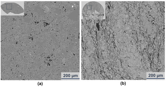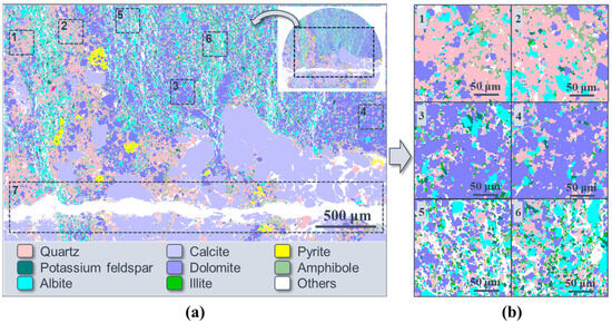 Another important aim for this research was to study the crack propagation under the influence of mineral distribution. Therefore, after the CT tests, according to the fracture pattern of each sample, a section parallel to the end face with a relatively large area was selected (Figure 1c,d), then the mineral analysis was conducted on this section by the AMICS system on FE-SEM (Figure 2b).