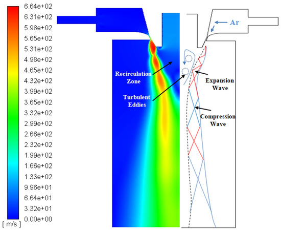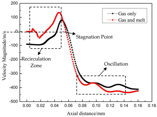 As described in the previous section, there is a recirculation zone below the inflow tube. Figure 8 shows the velocity change curve on the center line of the flow field. Initially, the airflow velocity value increased, then decreased, and the recirculation zone length was about 40 mm below the stagnation point. In addition, the velocity direction was downward, and the velocity gradually increased (maximum 453 m/s). The velocity stagnation points in both single-phase and two-phase flow conditions are located at the downstream end of the recirculation zone. The velocity variation in two-phase flow conditions is greater due to the introduction of high-temperature melt, which increases jet turbulence. The velocity oscillation observed at the end of the main jet zone is attributed to the coherent effect of expansion waves. The gas expansion and compression at the inner side of the sonic boundary has the opposite effect on gas flow at the axial position because the gas velocity inside the sonic boundary on both sides changes in opposite directions, causing violent velocity fluctuations.
