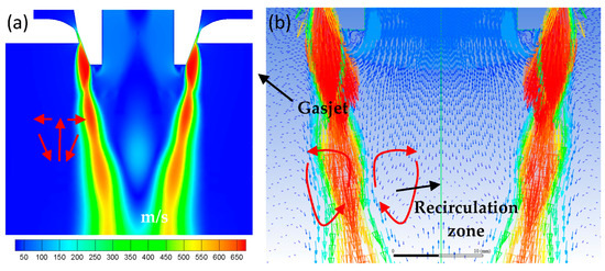 (a) Velocity contour of recirculation zone; (b) velocity vector diagram (m/s).