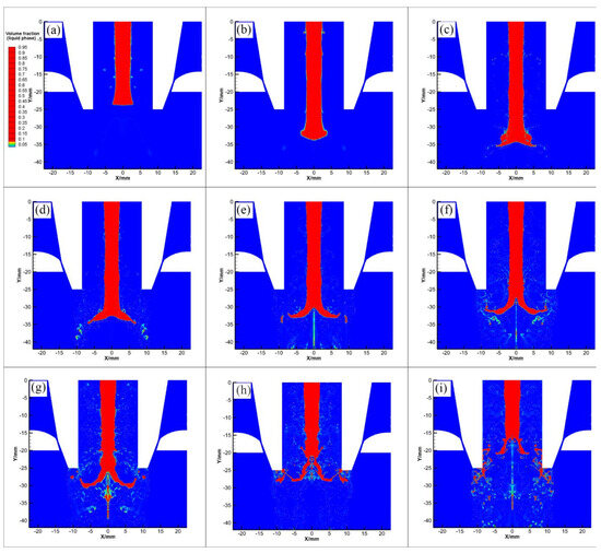 Fragmentation morphology of high-temperature melts in different stages of primary atomization (a) Time = 0.015 s; (b) Time = 0.020 s; (c) Time = 0.026 s; (d) Time = 0.0264 s; (e) Time = 0.0268 s; (f) Time = 0.0270 s; (g) Time = 0.0282 s; (h) Time = 0.0290 s; (i) Time = 0.0304 s.