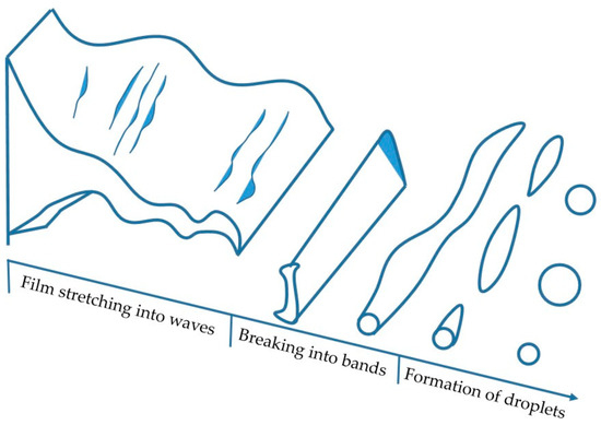 The most widely accepted theory of fragmentation was proposed by Rayleigh, who argued that disturbances inevitably occur in a gas flow field when there are disturbances in the liquid stream [27]. The increasing amplitude of the disturbance will result in the liquid jet’s destabilization and fragmentation into droplets. Based on Rayleigh’s study, Dombrowski et al. [28] proposed a liquid flow fragmentation model in which the liquid film gradually extends and breaks into droplets as the perturbation wave grows, as shown in Figure 10. The molten metal stream is first extended into a liquid film by airflow perturbation. The film progresses into a wave, then a half wave, and finally a band. The film’s thickness and wavelength determine the band’s length and width.