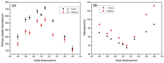 Velocity and diameter distributions of the parent droplets. (a) Droplet diameters (μm) at positions X = −5 mm and X = −10 mm; (b) velocity (m/s) at position X = −5 mm and X = −10 mm lines.