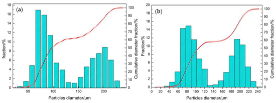 We investigated the effects of gas pressure at the nozzle inlets on powder particle size. The size distribution of droplet particles was obtained by monitoring the exit boundary of the physical model and counting the escaping particles, as shown in Figure 12. At an atomization pressure of 5 MPa (Figure 12a) and 5.5 MPa (Figure 12b), the particle size distribution of the titanium alloy powder is double-peaked, and powder in the range of 150 to 250 μm particle size accounts for more than 30%. The average particle size of the powder is larger, indicating that the secondary atomization process under this pressure is insufficient. The double-peaked phenomenon disappears at atomization pressures >5 MPa, and the particle size distribution shows a single-peaked normal distribution. With increasing gas pressure, the average particle size of the powder gradually decreases, and the powder exhibits a narrower particle size distribution. Figure 12f compares the cumulative particle size distribution of the powders under different simulated pressure conditions. The cumulative distribution curve shifts to the left as the atomization air pressure increases, i.e., the average particle size of the powders decreases. The median diameters (d50) of the powders are 110.5, 98.2, 90.3, 84.2, and 65.7 μm, respectively. Therefore, higher pressures may improve the efficiency of fine powder preparation.