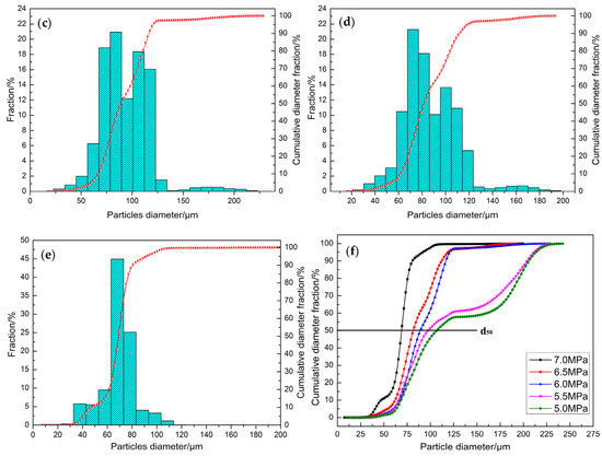 Particle size distributions of particles originating from increasing gas pressures. (a) 5.0 MPa; (b) 5.5 MPa; (c) 6.0 MPa; (d) 6.5 MPa; (e) 7.0 MPa; (f) Mass-based cumulative size distribution plots for five different pressures.